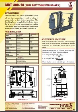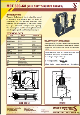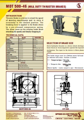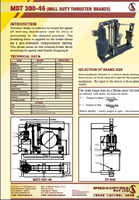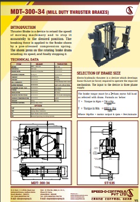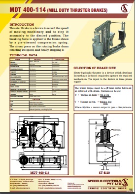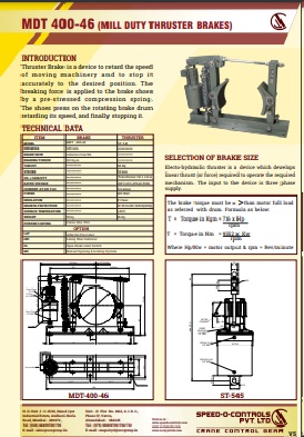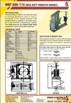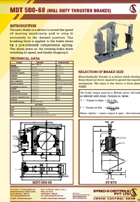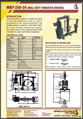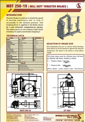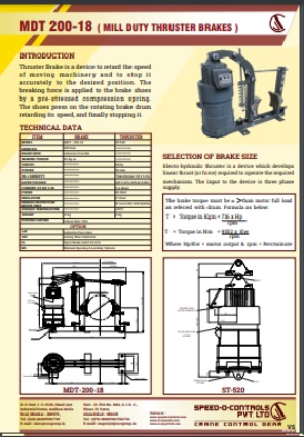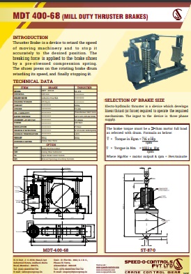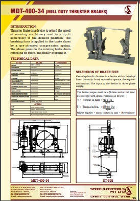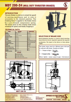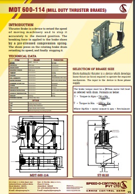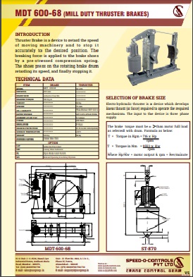 Thruster Brake is a device to retard the speed of moving machinery and to stop it accurately to the desired position. The breaking force is applied to the brake shoes by a pre—stressed compression spring.