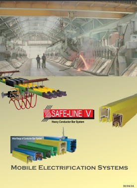 Safeline V insulated conductor bar system are used for power transmission for mobile machinery. Current capacity ranges from 500 Amps to 2000 Amps rated at 100% duty cycle and 35°C ambient temperature with nominal voltage up to 600V. Insulated Conductor Bar provides safe and economical power for track guided mobile machinery.