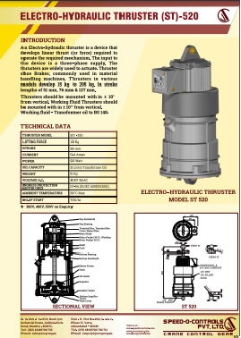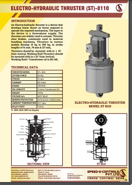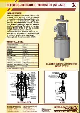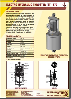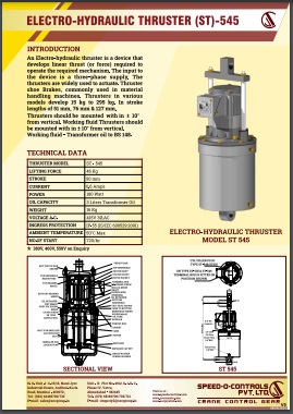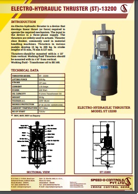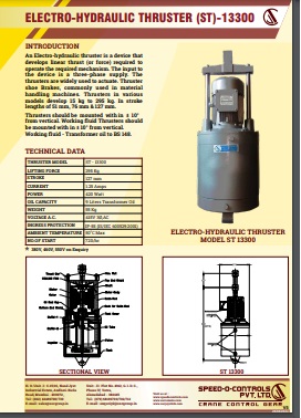 Electro-Hydraulic Thruster is a device which develops linear thrust (or force) required to operate the desired mechanism. The Thrusters are widely used to actuate thruster shoe brakes, commonly used in material handling equipments. Thrusters are available in various models.